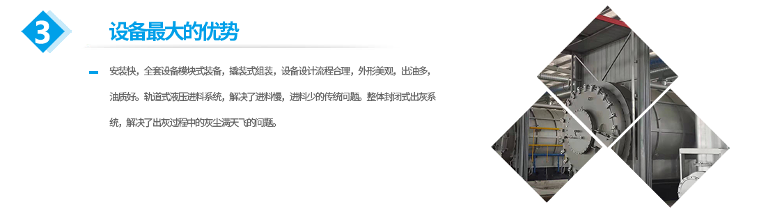 公司生產(chǎn)的設(shè)備的優(yōu)勢(shì):安裝快,全套設(shè)備模塊式裝備,撬裝式組裝,設(shè)備設(shè)計(jì)流程合理,外形美觀,出油多,油質(zhì)好。軌道式液壓進(jìn)料系統(tǒng),解決了進(jìn)料慢,進(jìn)料少的傳統(tǒng)問(wèn)題。整體封閉式出灰系統(tǒng),解決了出灰過(guò)程中的灰塵滿(mǎn)天飛的問(wèn)題。